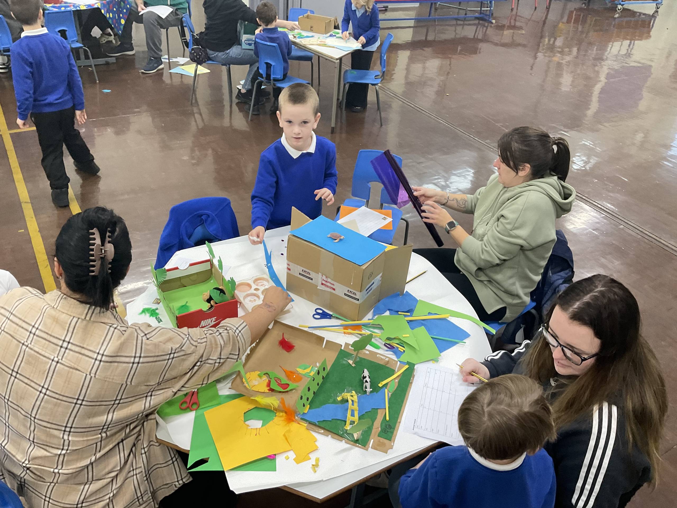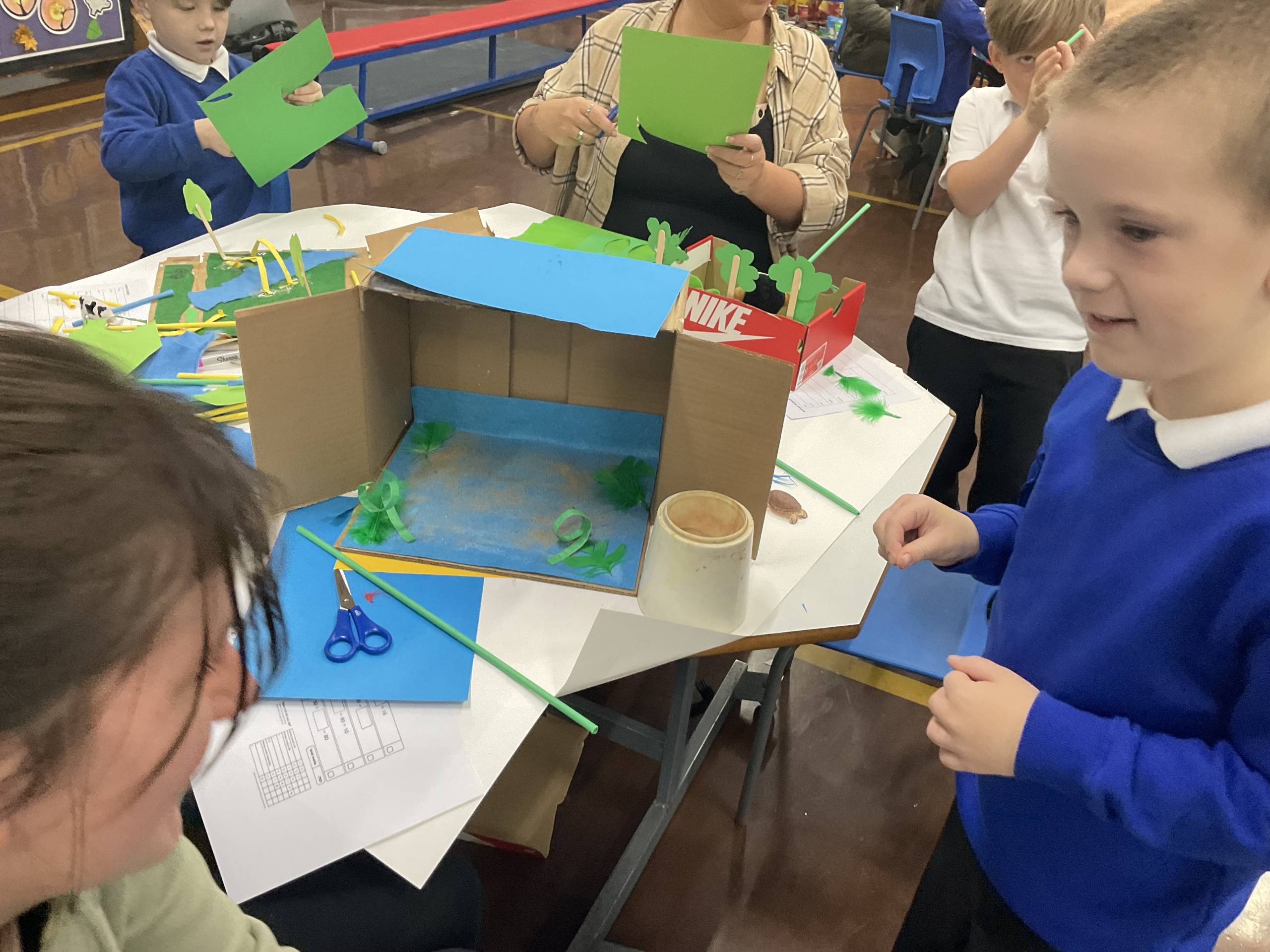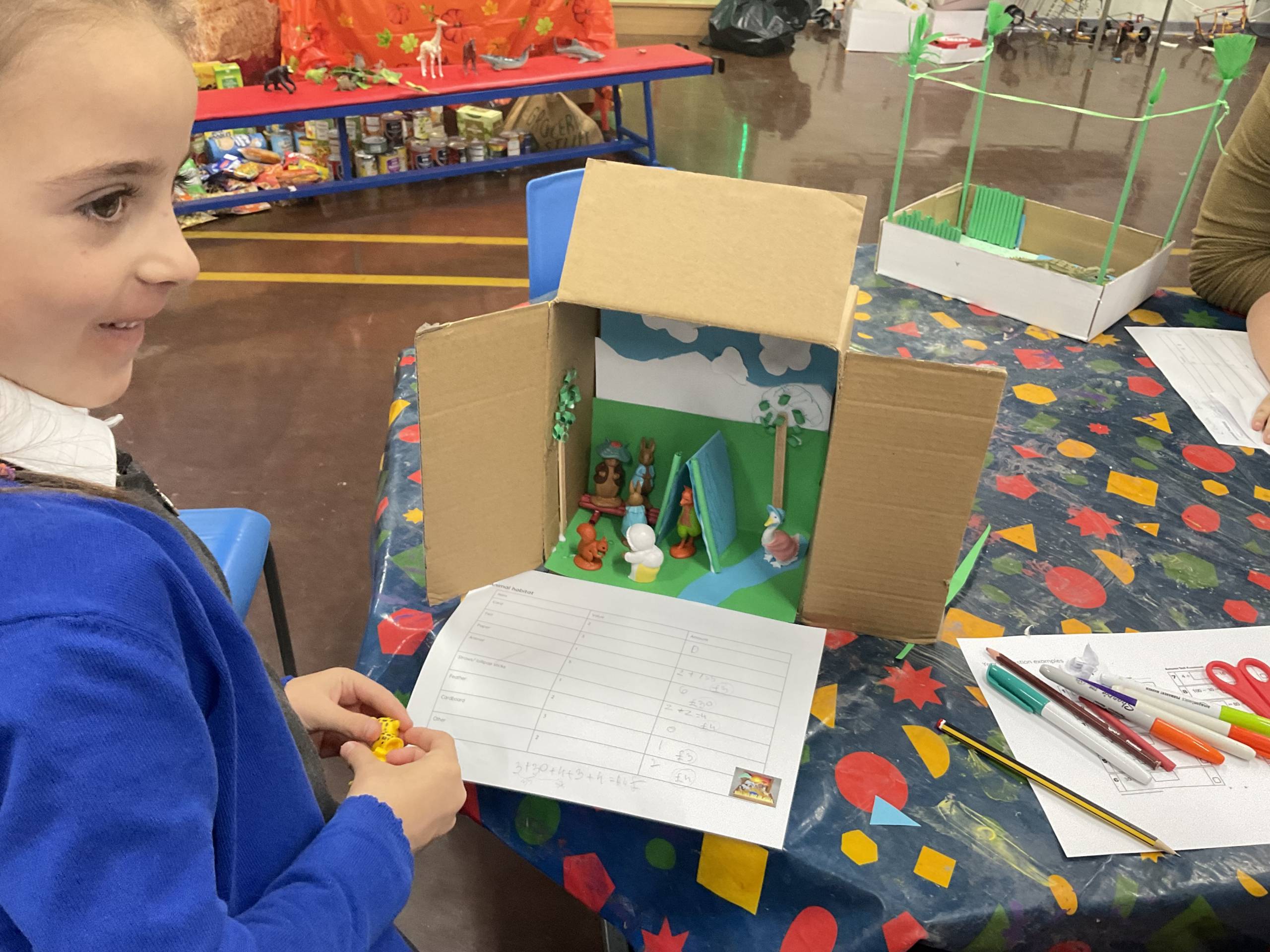 In Science we have been learning about animals including humans. We introduced the term habitats and used a variety of materials to create them. We focused on what the animal would need to survive, by using a variety of materials we were able to show where they live and some children showed what food they eat! We then made links to maths by giving each material a cost. Our workshop allowed the parents/ carers to work collaboratively with their child to create the habitats whilst also using addition to find an overall total cost.